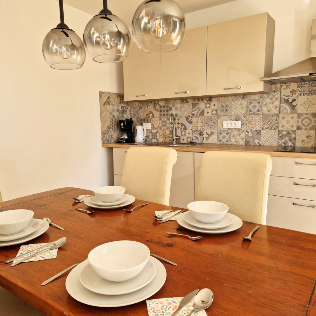 Stanovanje vključuje 2 spalnici z udobnimi zakonskimi posteljami in tretjim ležiščem za dodatno osebo. V popolnoma opremljeni kuhinji boste našli vse za uživanje v kulinaričnih radostih. Hiša je klimatizirana in ima dobro Wi-Fi povezavo.