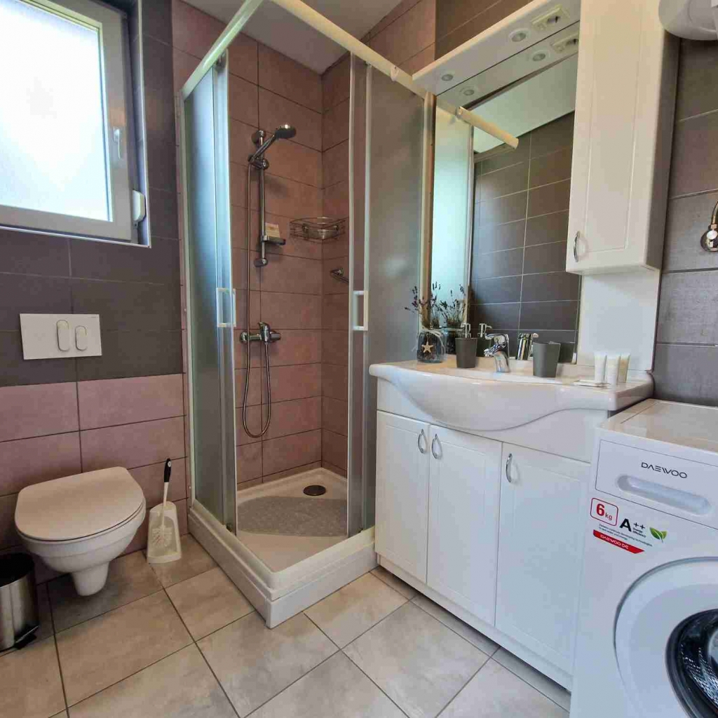 Apartma v pritličju ponuja odprt in svetel bivalni prostor s popolnoma opremljeno kuhinjo, jedilno mizo za 4 osebe ter udobnim raztegljivim kavčem za dodatni 2 osebi. V pritličju se nahaja tudi kopalnica s prho.