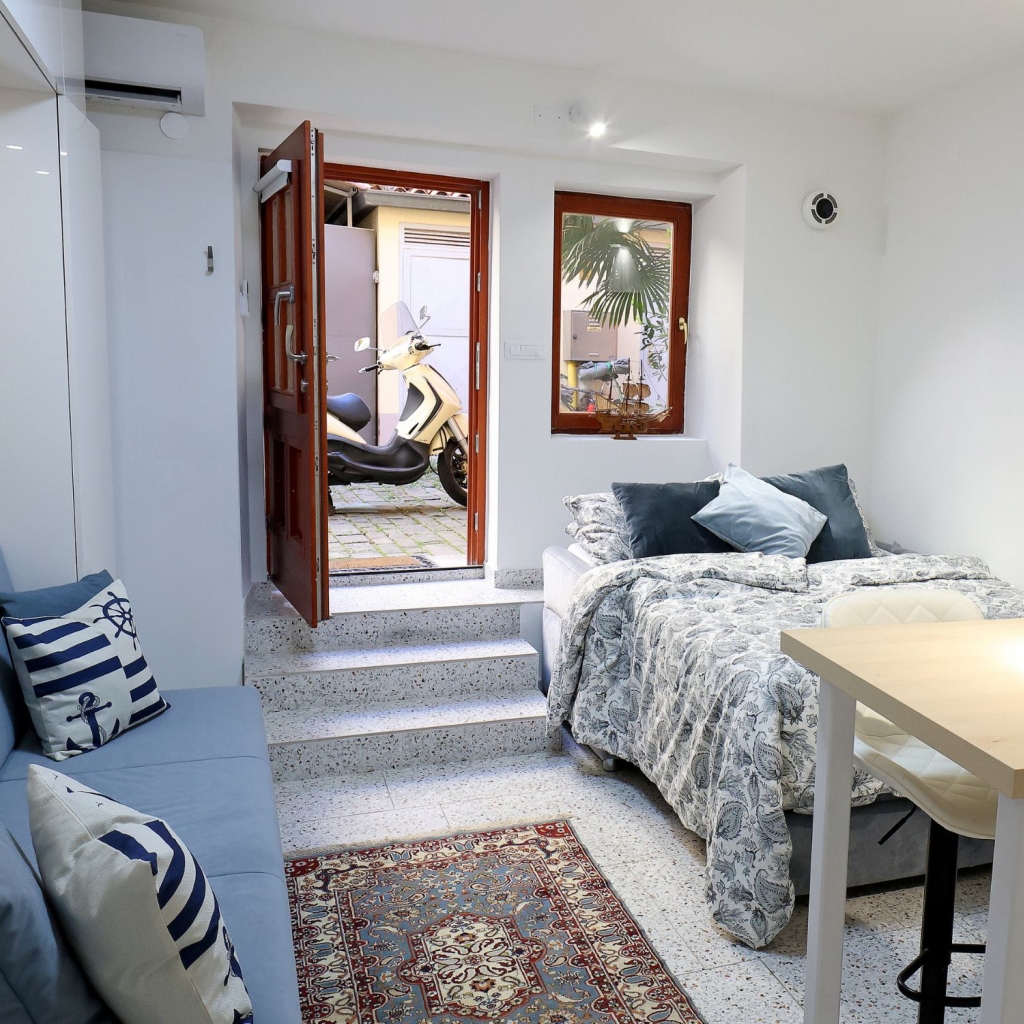 Studio se nahaja v pritličju večstanovanjske hiše in ponuja prijetno, funkcionalno zasnovano bivanje za sproščen oddih ob morju. Prostor je svetel in udoben, z zakonskim ležiščem za 2 osebi, dodatnim sedežnim kotičkom, prostorno omaro ter jedilno mizo, ki služi tudi kot kuhinjski pult.