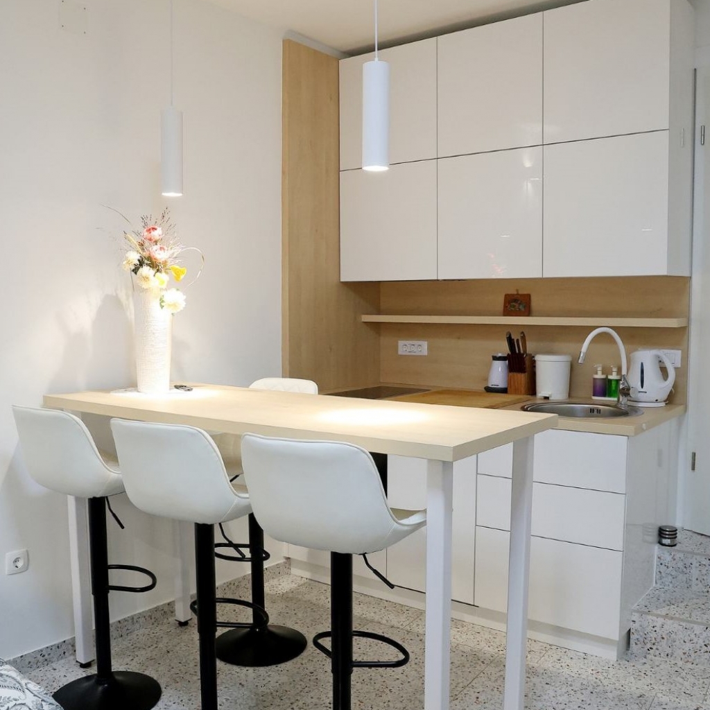 Kuhinja je del osrednjega prostora in je v celoti opremljena s kuhalno ploščo, napo, hladilnikom, pomivalnim strojem ter vso potrebno posodo in priborom.