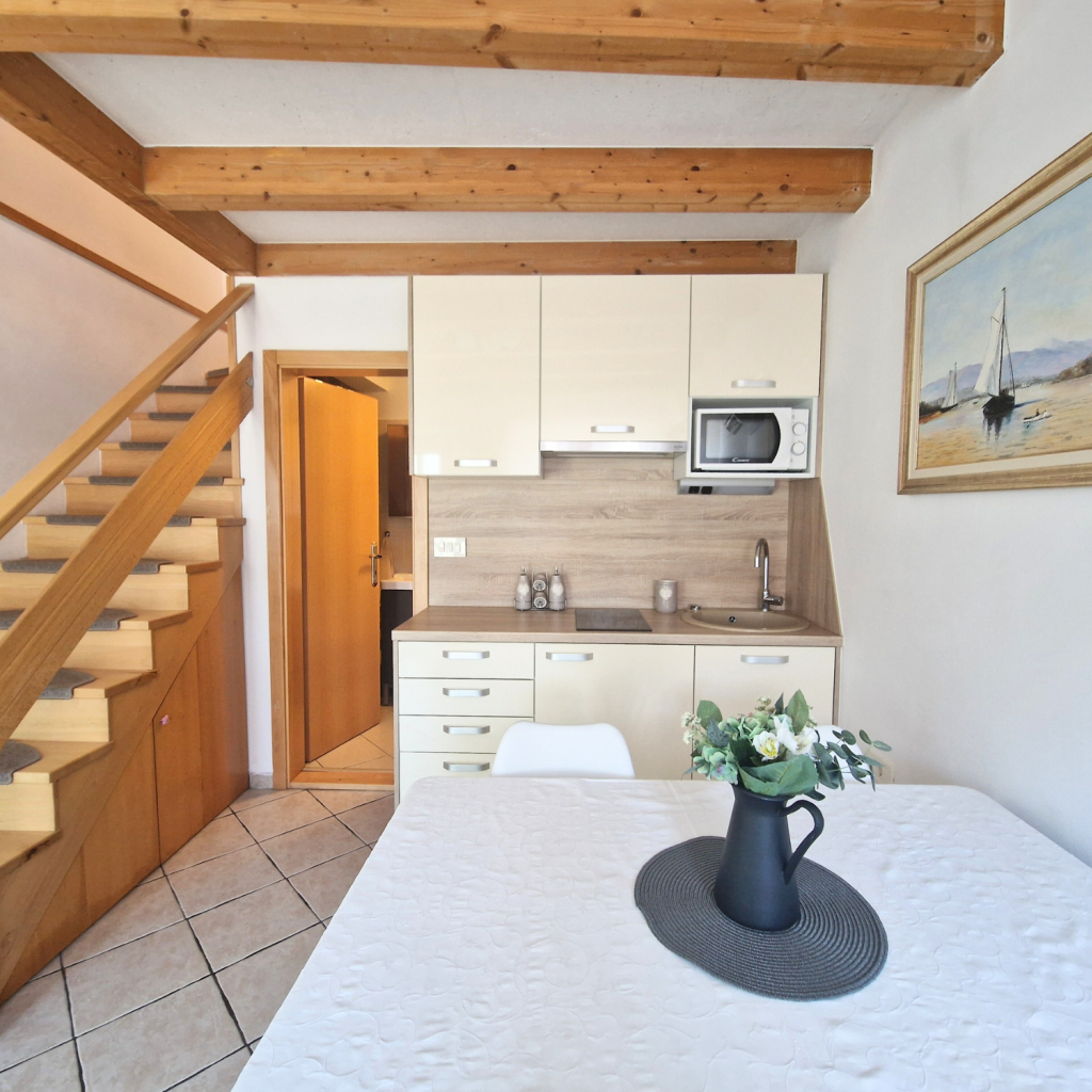 V prvem nadstropju je spalnica z zakonsko posteljo in raztegljivim dvojnim ležiščem. V pritličju se nahaja popolnoma opremljena kuhinja z jedilno mizo za štiri osebe ter kopalnica s prho. Obe etaži sta klimatizirani, na voljo pa je tudi hitri brezžični internet. Posteljnina in brisače so vključene v ceno najema. Parkirišče je na voljo čez cesto na javnih parkirnih mestih.