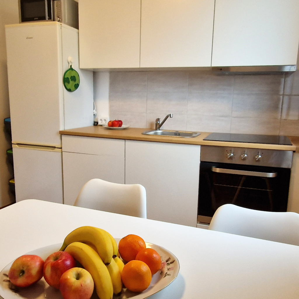 Alle Wohnungen wurden 2024 renoviert und präsentieren sich mit neuen Küchen, Betten und renovierten Badezimmern. Die Küchen sind komplett ausgestattet mit Backofen, Mikrowelle, 4-Platten-Ceranfeld, Kühlschrank, Gefrierschrank und allem nötigen Küchengeschirr. Sie können Ihre Lieblingsgerichte am Esstisch in der Küche oder auf der Terrasse/dem Balkon genießen.