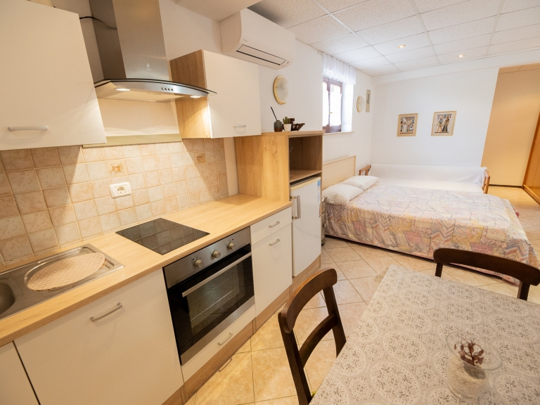 Studio Vita je prijeten studio v pritličju, ki sprejme do 3 osebe. Ima odprt tloris s spalnico, kuhinjo in jedilnim kotom, poleg tega pa kopalnico s tušem in pralnim strojem.